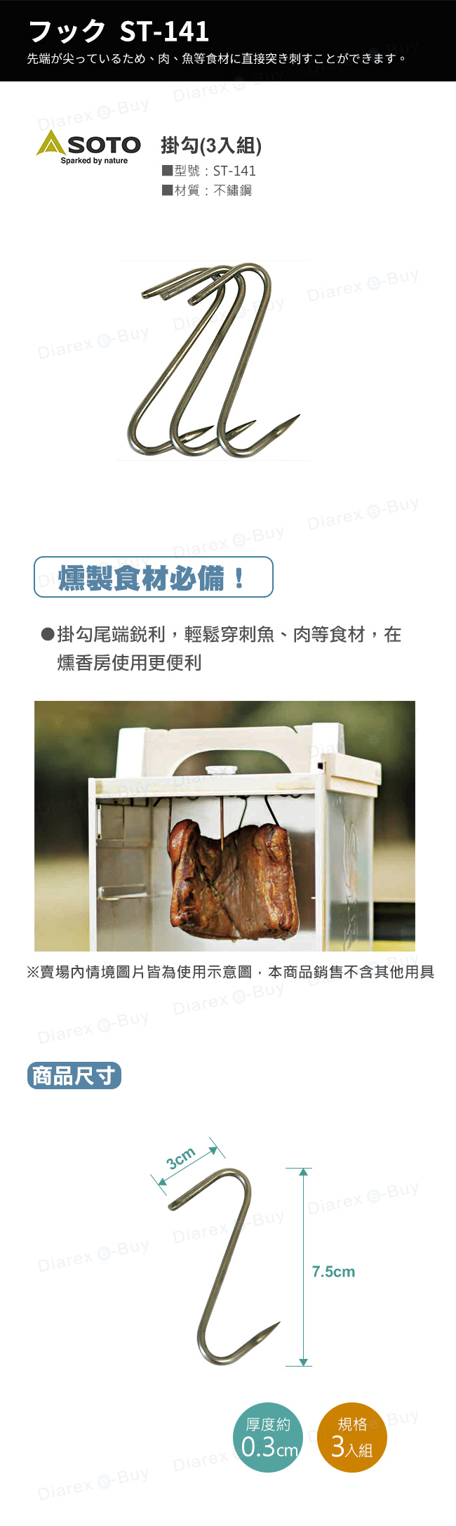 ●掛勾尾端銳利,可輕鬆穿刺魚肉等食材